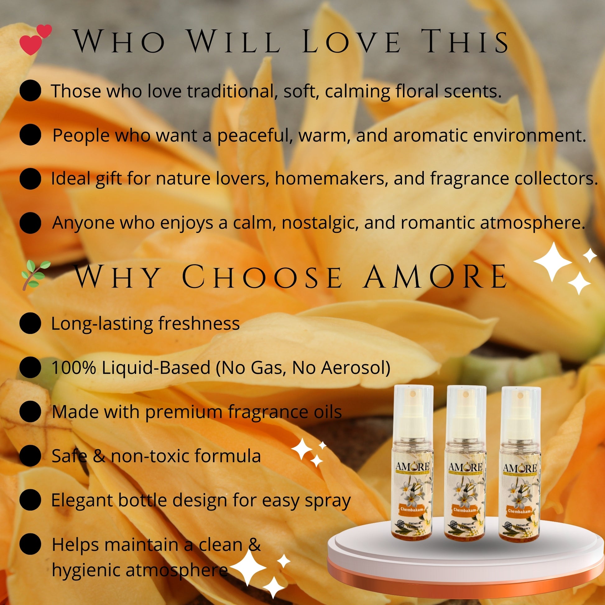 A soothing floral fragrance inspired by the natural aroma of Chembakam flowers. It refreshes your space instantly while creating a calm, peaceful, and positive atmosphere. Perfect for homes, cars, offices, and prayer rooms.