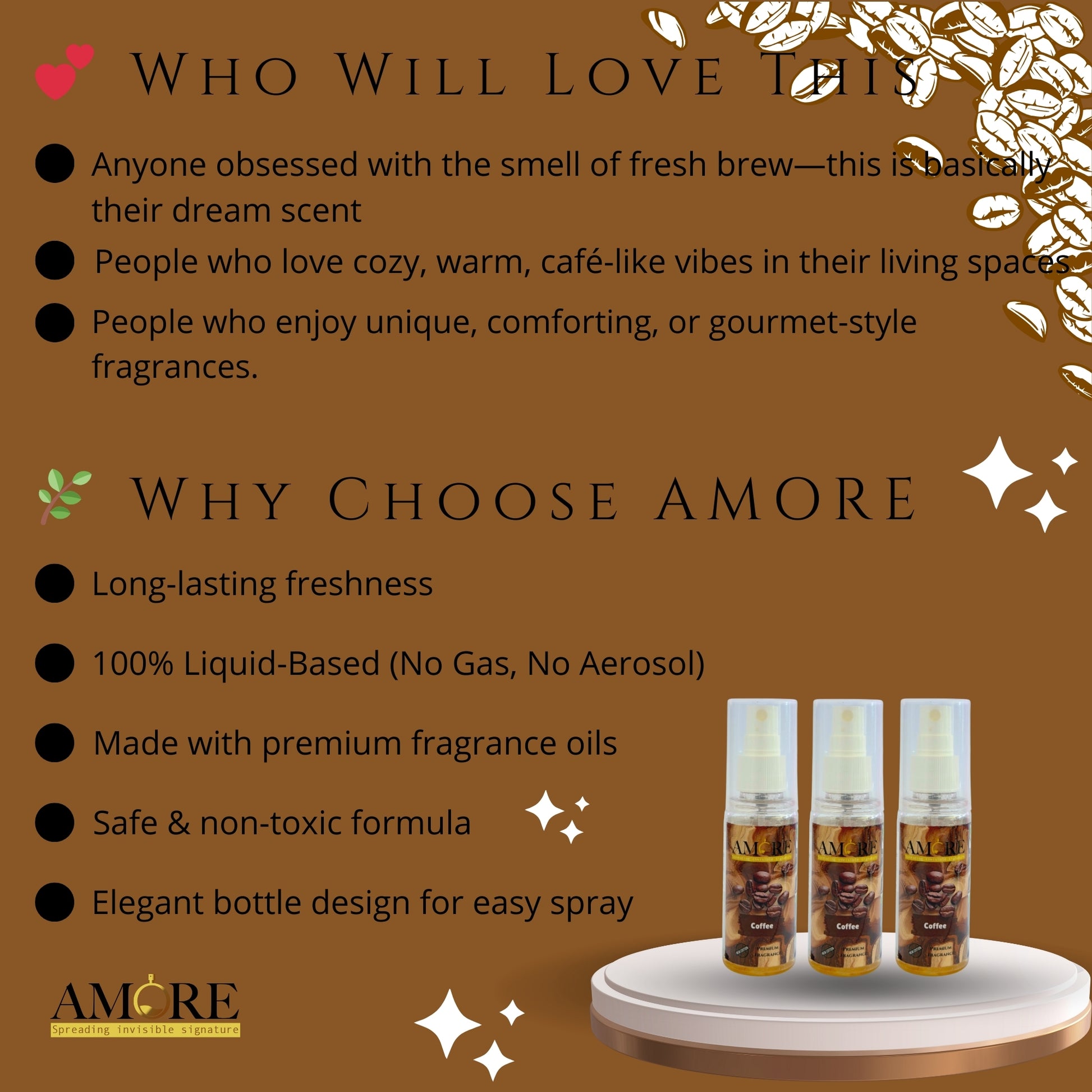 A rich and warm coffee-inspired fragrance that instantly refreshes your space. Its cozy aroma energizes the mind, removes unwanted odors, and creates a welcoming, comforting atmosphere. Ideal for homes, cars, offices, and cafés.